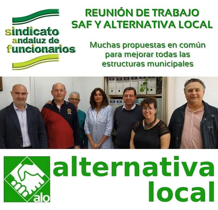 Nuestro candidato Pedro Amalio Moguer, nuestra portavoz Carmen Rodríguez y Soledad Vila en representación de la Ejecutiva de Alternativa Local han mantenido una fructífera reunión de trabajo con la Sección Sindical del SAF en el Ayuntamiento de Los Palacios y Villafranca, encabezada por su Presidente José Amador Fernández, acompañado por una nutrida representación de dicha sección sindical, a los que felicitamos por los resultados de las últimas elecciones sindicales.